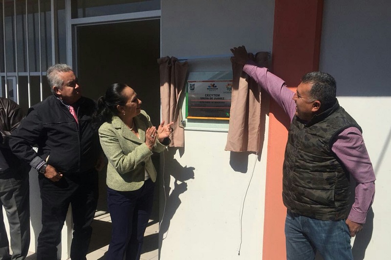 Unión de Juárez, mpio. de José Sixto Verduzco, Michoacán, a 14 de diciembre de 2017.- La directora general del Colegio de Estudios Científicos y Tecnológicos del Estado de Michoacán (CECyTEM), Carmen Escobedo Pérez, inauguró hoy ocho aulas, un módulo de sanitarios, un área administrativa y una plaza cívica en el Centro de Educación Superior a Distancia (CEMSaD) de esta localidad, donde se invirtieron 2 millones 960 mil pesos.