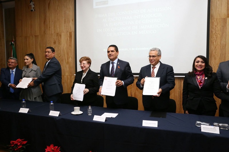 Morelia, Michoacán, a 3 de diciembre de 2017.- Hoy Michoacán da un paso sustancial hacia la igualdad y la eliminación de la violencia contra la mujer, al ser la entidad número 29 en signar la firma del convenio de adhesión al «Pacto para Introducir la Perspectiva de Género en los Órganos de Impartición de Justicia en México», donde el Gobernador Constitucional Silvano Aureoles Conejo fungió como testigo de honor.