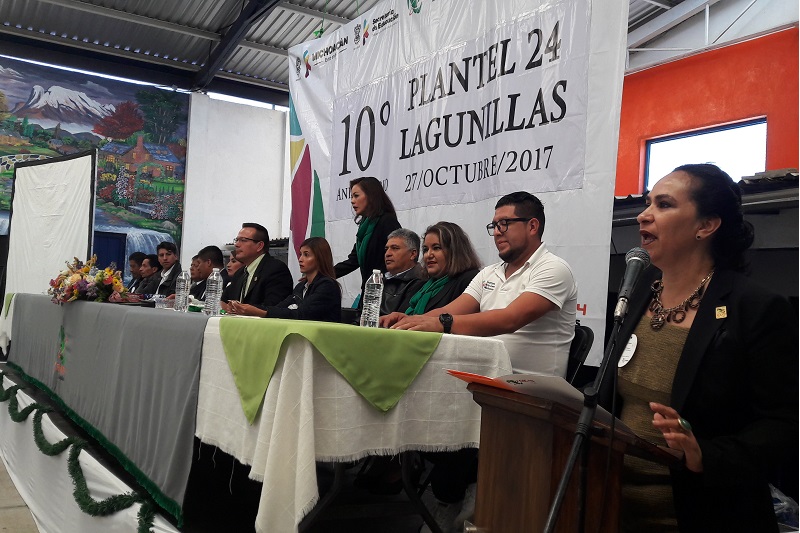 Morelia, Michoacán, a 29 de octubre de 2017.- La directora general del Colegio de Estudios Científicos y Tecnológicos del Estado de Michoacán (CECyTEM), Carmen Escobedo Pérez, encabezó los actos de aniversario de los CEMSaD (Centro de Educación Media Superior a Distancia) de Cuto de la Esperanza y Lagunillas.